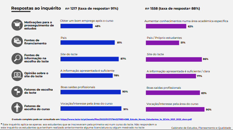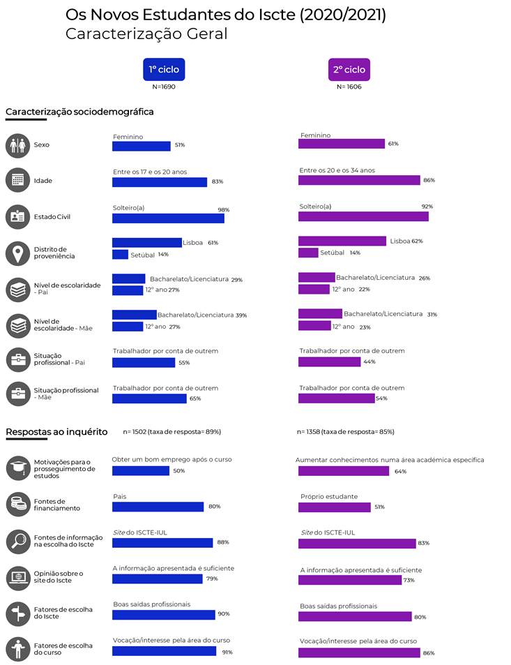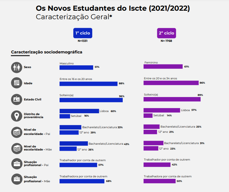 Os resultados constam de um inquérito realizado junto dos 1331 novos estudantes do 1º ciclo (licenciatura) e 1768 novos estudantes do 2º ciclo (mestrado), no ano letivo de 2021-22. Desta análise foram excluídos estudantes que tenham anteriormente realizado qualquer outro curso no Iscte.